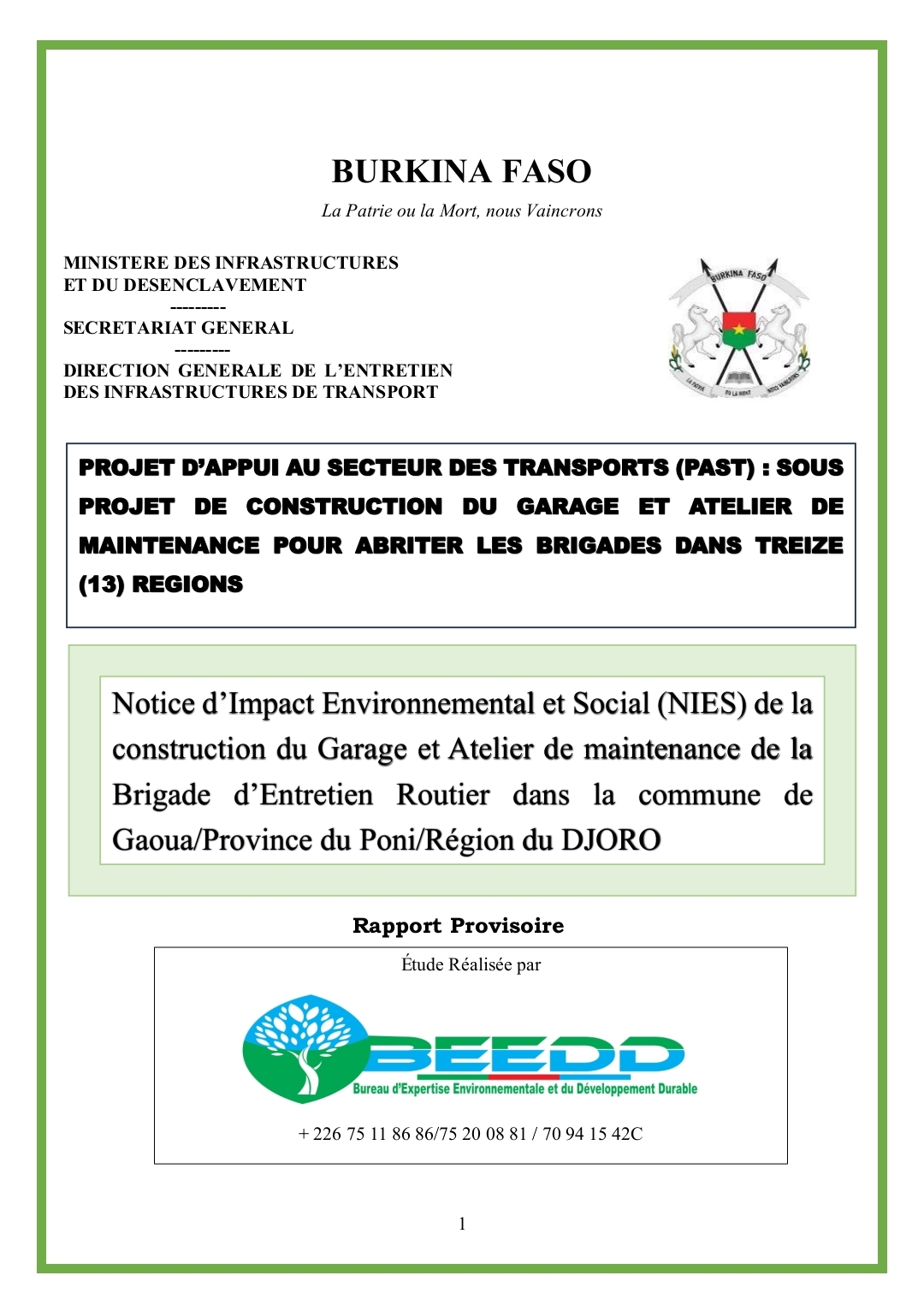 Notice d'Impact Environnemental et Social (NIES) du projet de construction du garage et atelier de maintenance de la Brigade d'Etretien Routier de Gaoua dans la région de DJORO